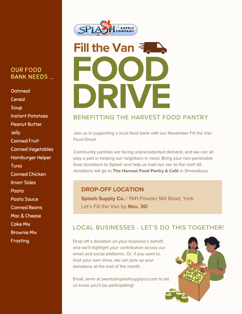 FILL THE VAN FOOD DRIVE: Bring your non-perishable food donations to Splash, and help us load our van to the roof! All donations go to The Harvest Food Pantry in Shrewsbury.